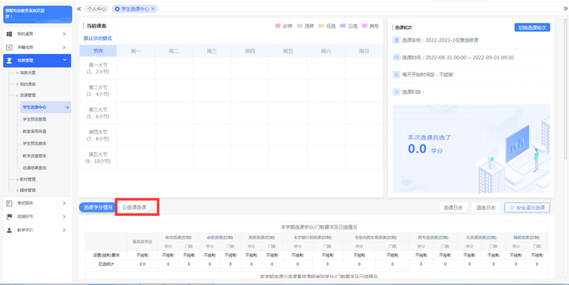 2.补选9月1512:00-9月1523:00(选课人数不足20人的课程不予开设,已选该类课程的学生可进行补选)